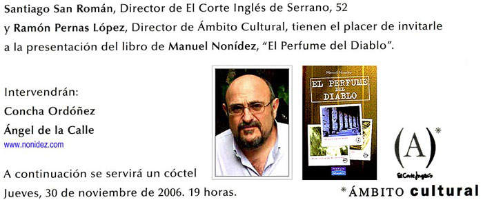 El próximo 30 de noviembre, a las 7 de la tarde en la 7ª planta de El Corte Inglés de Serrano 52, bajo el auspicio de Ámbito Cultural, Concha Ordóñez, directora general de publicaciones de Pearson Alhambra, y Ángel de la Calle, director adjunto de la Semana Negra de Gijón, además de ilustrador, dibujante, y autor de un cómic sobre Tina Modotti, acompañarán a Manuel Nonídez en la presentación de El perfume del diablo.
